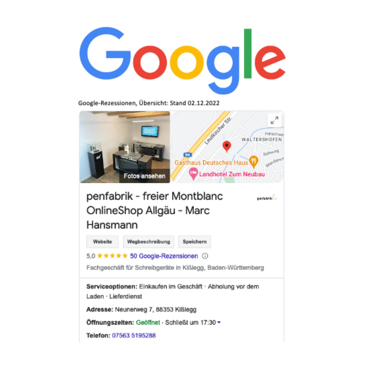 Auch auf google sind die Kundenstimmen äußerst erfreulich. Wir bedanken uns bei allen Kunden, die uns mit einer neuen Rezession unterstützen.