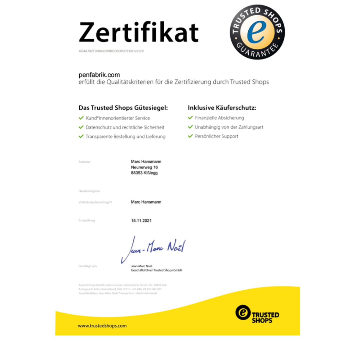 penfabrik wurde von Trusted Shop zertifiziert und gehört zu den garantiert sicheren Shops in Europa. Dazu gehört eine tiefgreifende Prüfung, die unsere Prozesse und Richtlinen durchleuchtet. Ständige Prüfverfahren sorgen dafür, dass das auch weiterhin so bleibt.